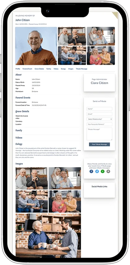 Upload your loved ones happiest memories in images, videos, eulogies & social media to an eTribute memorial page and linked QR code.